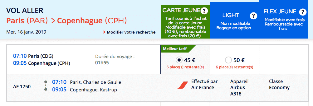 La réduction n’est pas automatique sur toutes les lignes ; il vaut mieux vérifier avant de réserver. Pour cela, rien de plus simple : une simulation sur le site d’Air France permet de mesurer l’avantage. Prenons un vol Paris (CDG), Copenhague (CPH) : le tarif affiché avec la carte jeune démarre à 45€ TTC, contre 50€ pour le tarif Light classique. La différence de prix n’est pas faramineuse sur ce segment, mais la carte ne se limite pas à une économie ponctuelle.